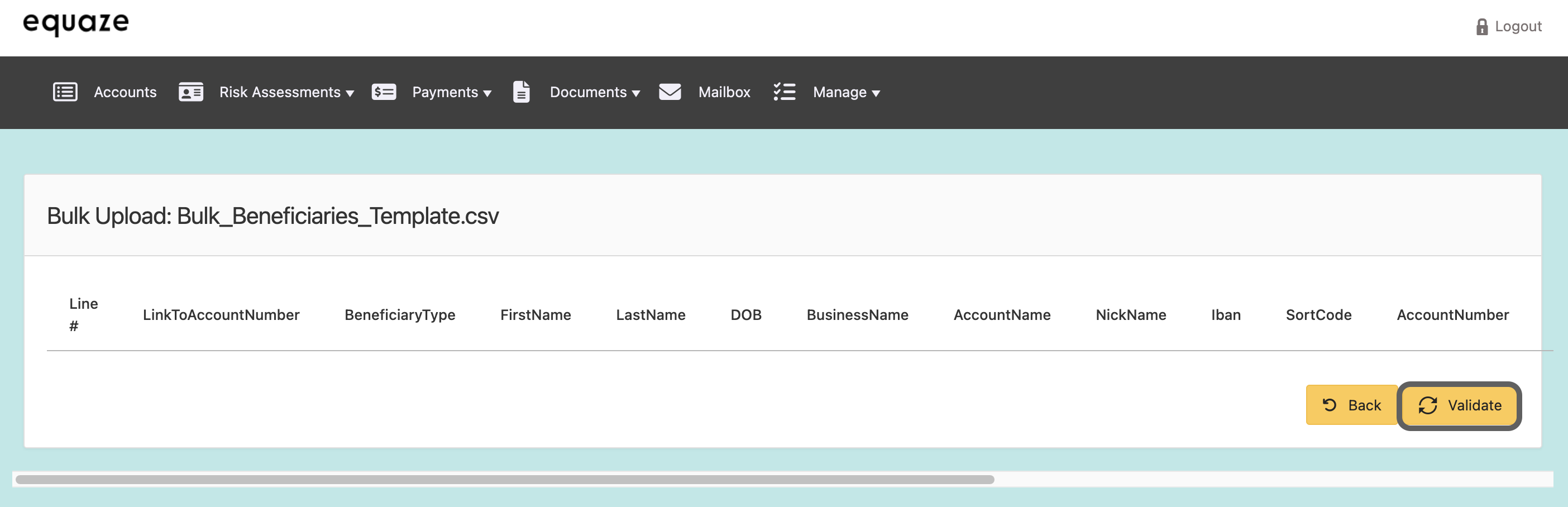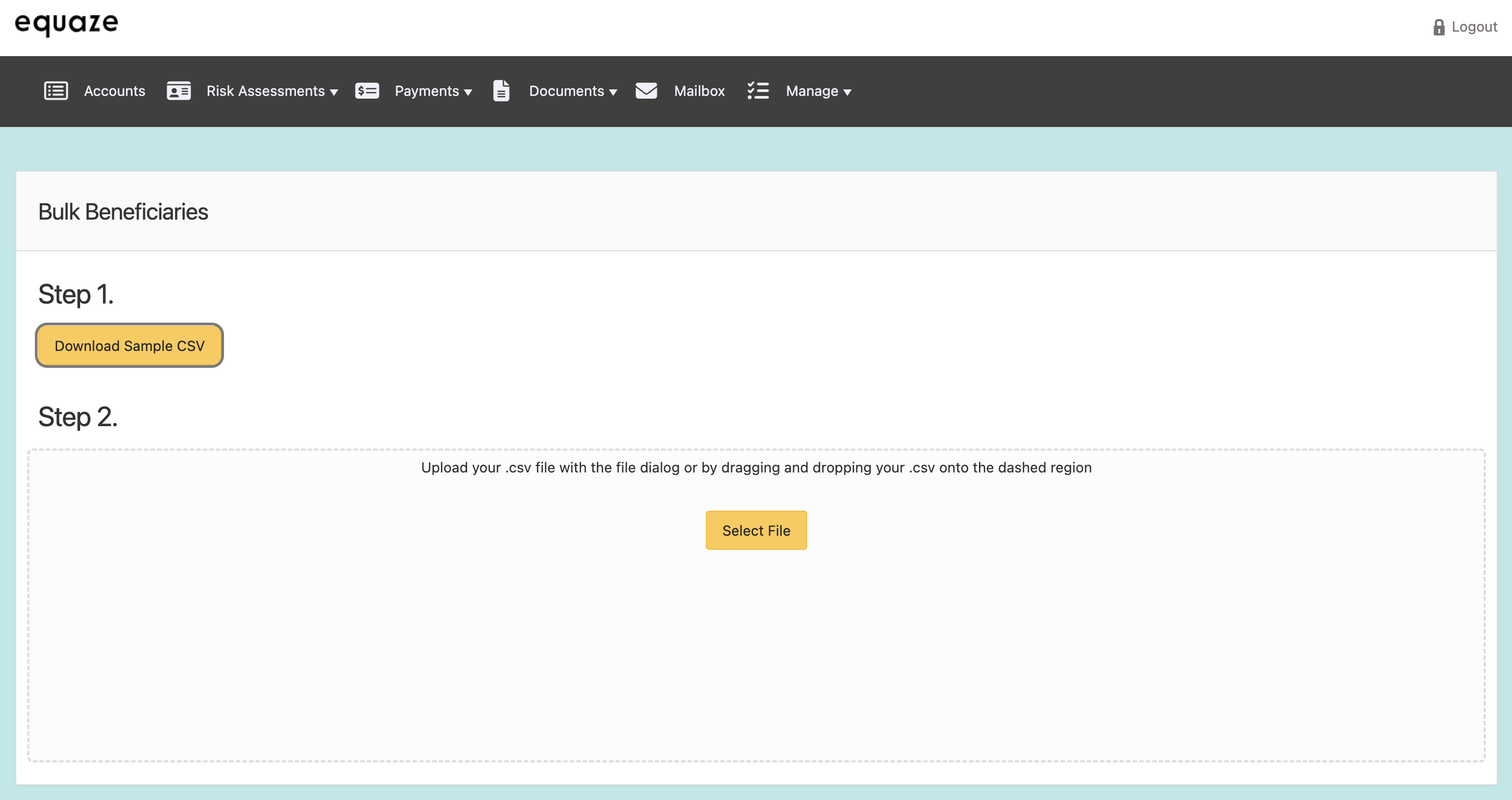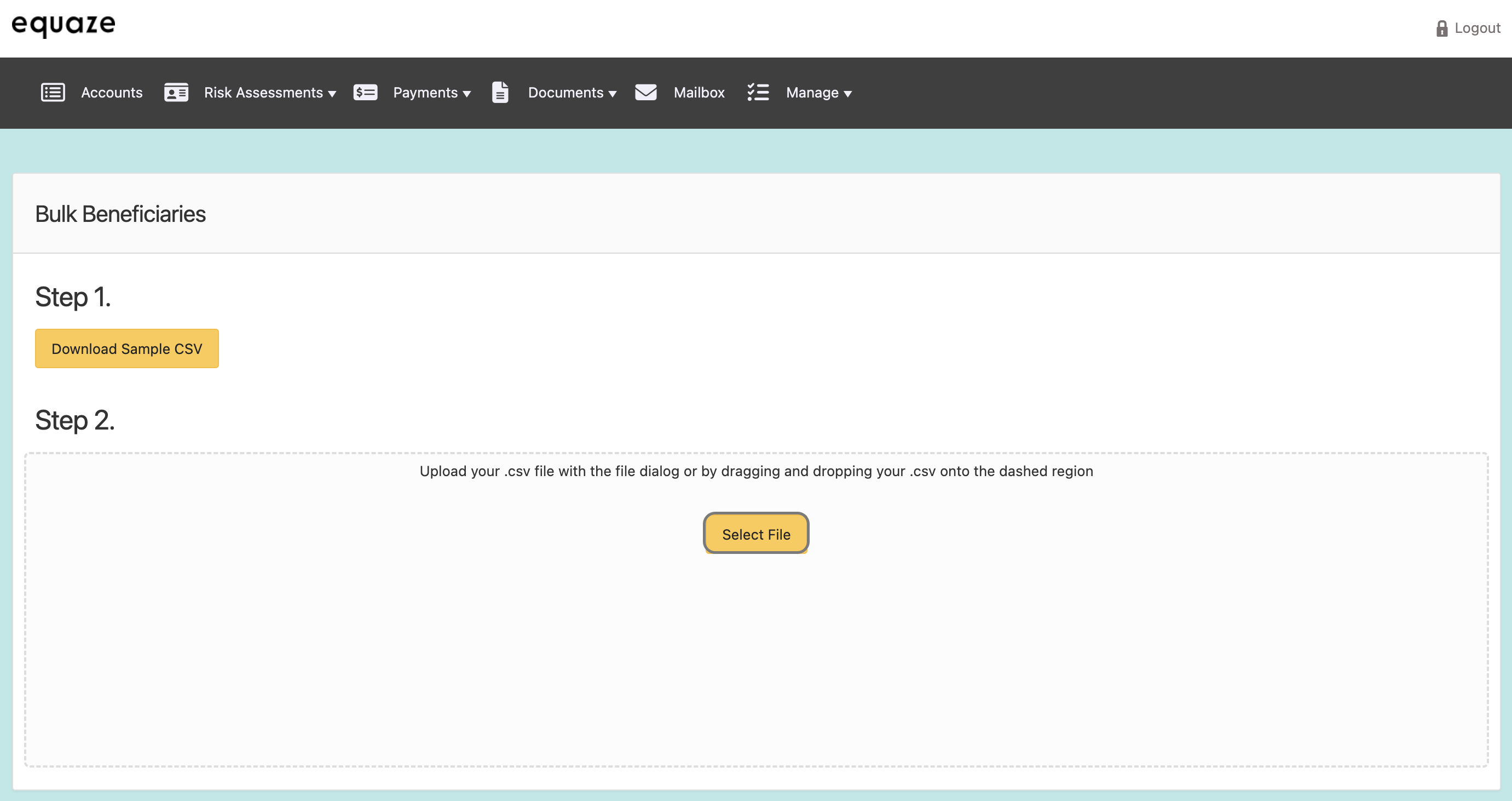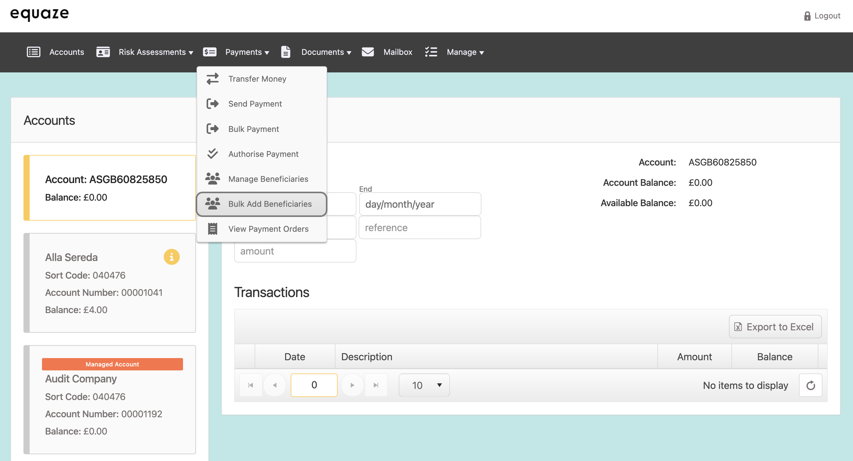 To start the process to bulk create beneficiaries, select the option Payments->Bulk Add Beneficiaries from the menu options.