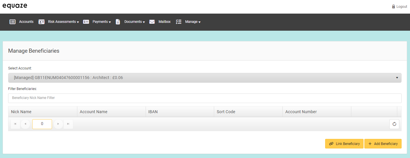 The Manage Beneficiaries page then appears, where you must choose an account to associate the beneficiary you will create.