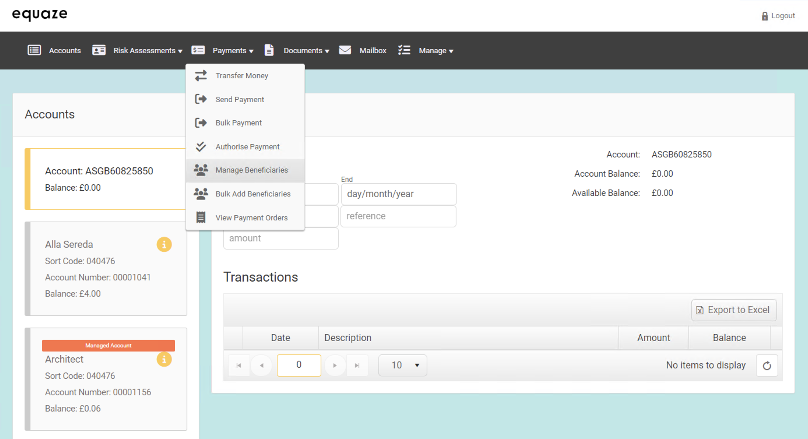 To create a beneficiary, select the options Payments > Manage Beneficiaries in the menu first.