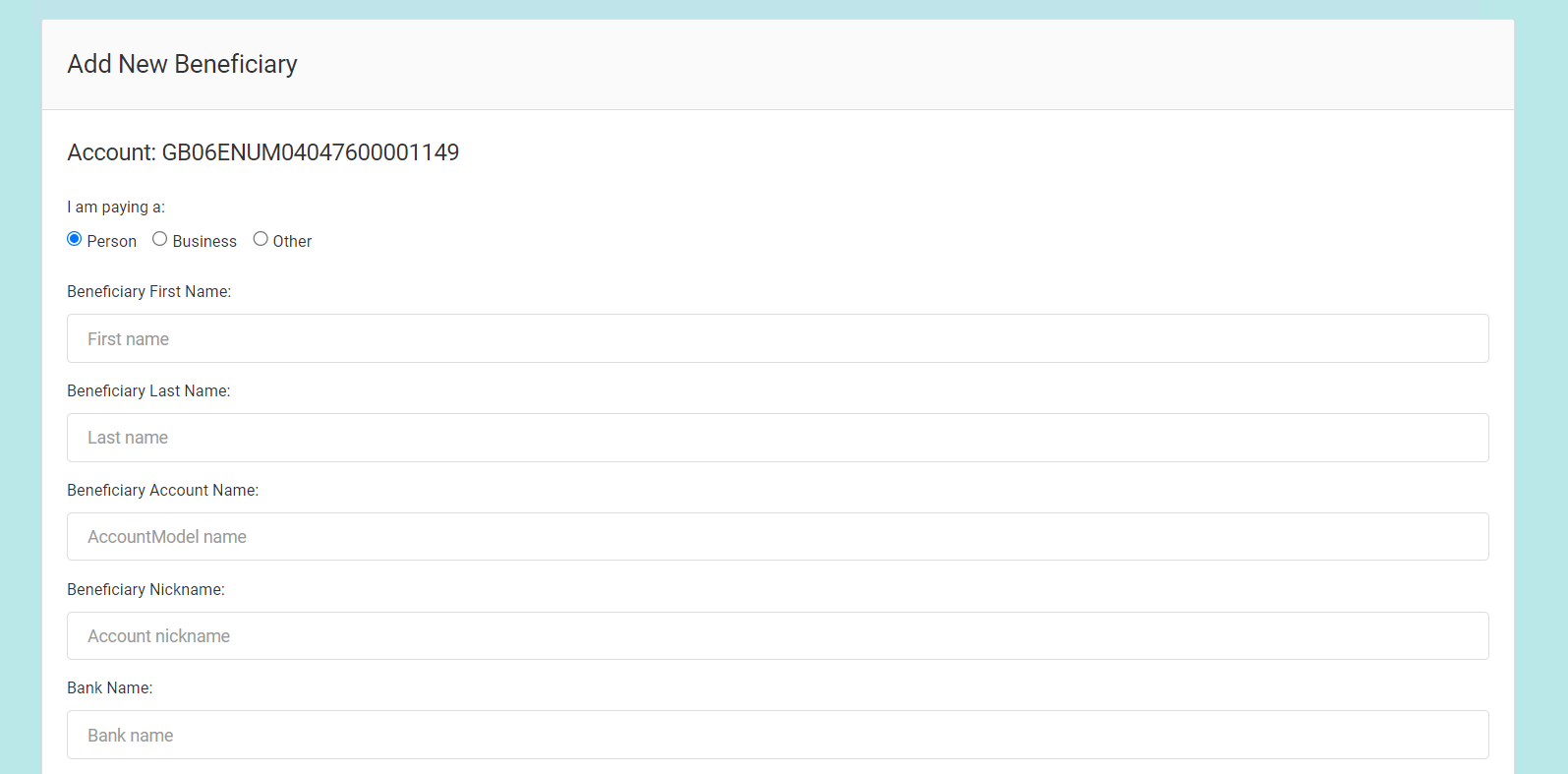 Note: If your permissions are not sole authority (that is to say, you need another user to authorise your requests for adding a new beneficiary), adding the new beneficiary requires approval from a user with the appropriate authorised permissions. It will remain pending in our system until the authorised user approves or rejects it. Note that you can’t authorise the creation of your new beneficiary.