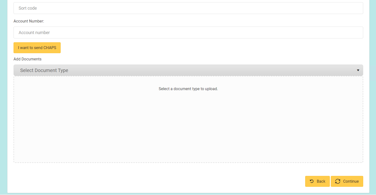 Aside from inputting beneficiary data, you can opt to attach any relevant document in the Add Documents field. To include one, you must first specify the type of document using the Select Document Type dropdown. Then, click the wide empty whitespace of the Add Documents field to open the file dialogue box of your operating system. Select one or more files to attach and then wait until the upload progress completes (indicated by a green checkmark icon).
