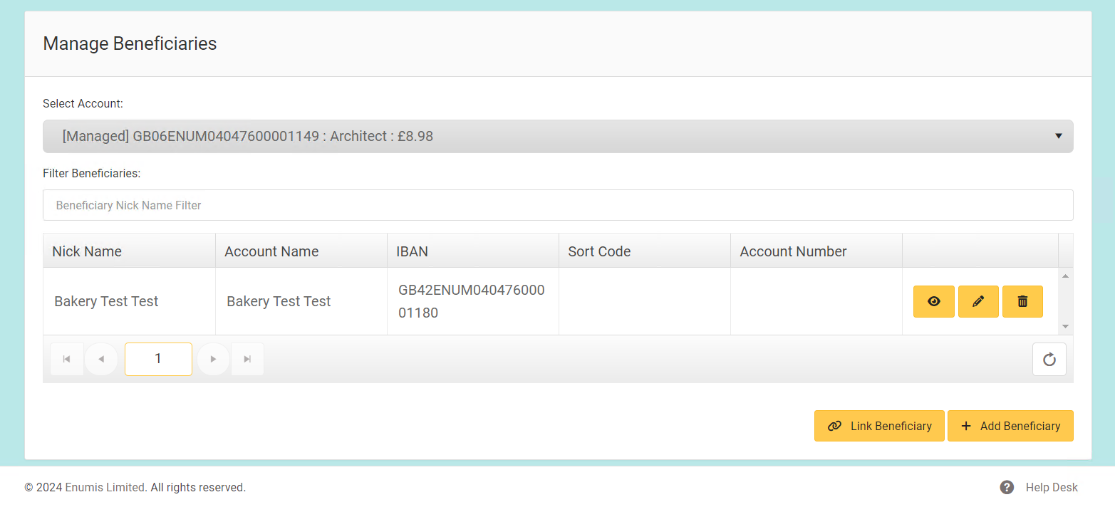 In the Select Account dropdown, choose an account. Then, upon choosing one, a list of beneficiaries already added to the selected account appears.