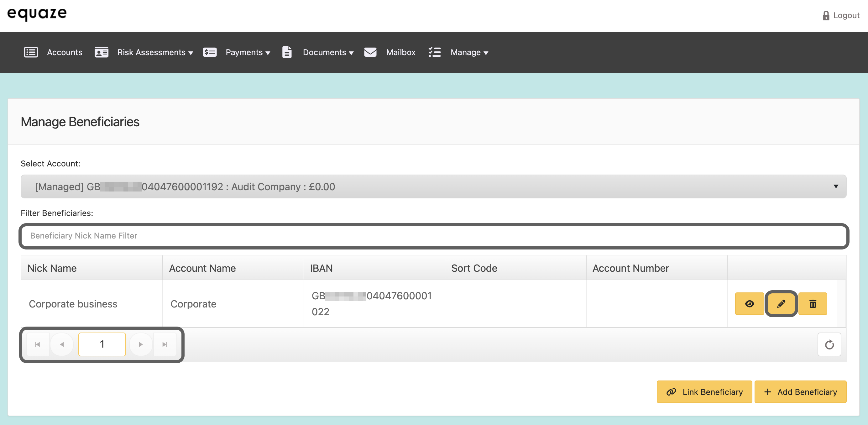 There are pagination controls at the bottom of the list. Assuming the list contains many records and you can’t see the beneficiary you want to delete, use the controls to move from one set of records to another. There is also the Filter Beneficiaries field to help you narrow down the beneficiaries displayed in the list.