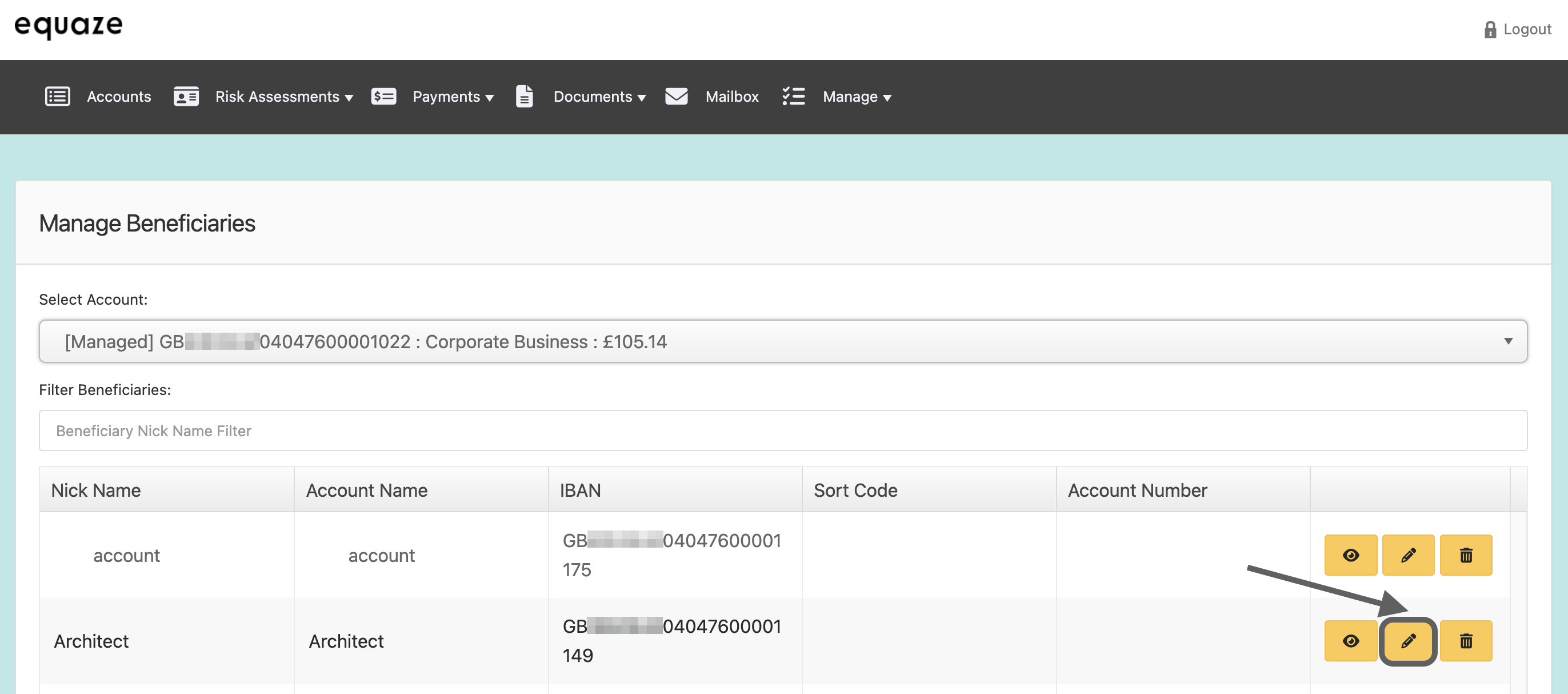 Click on the “Edit” icon (represented as a pencil) next to the beneficiary you want to edit.
