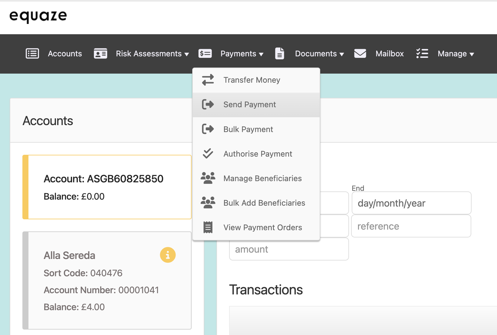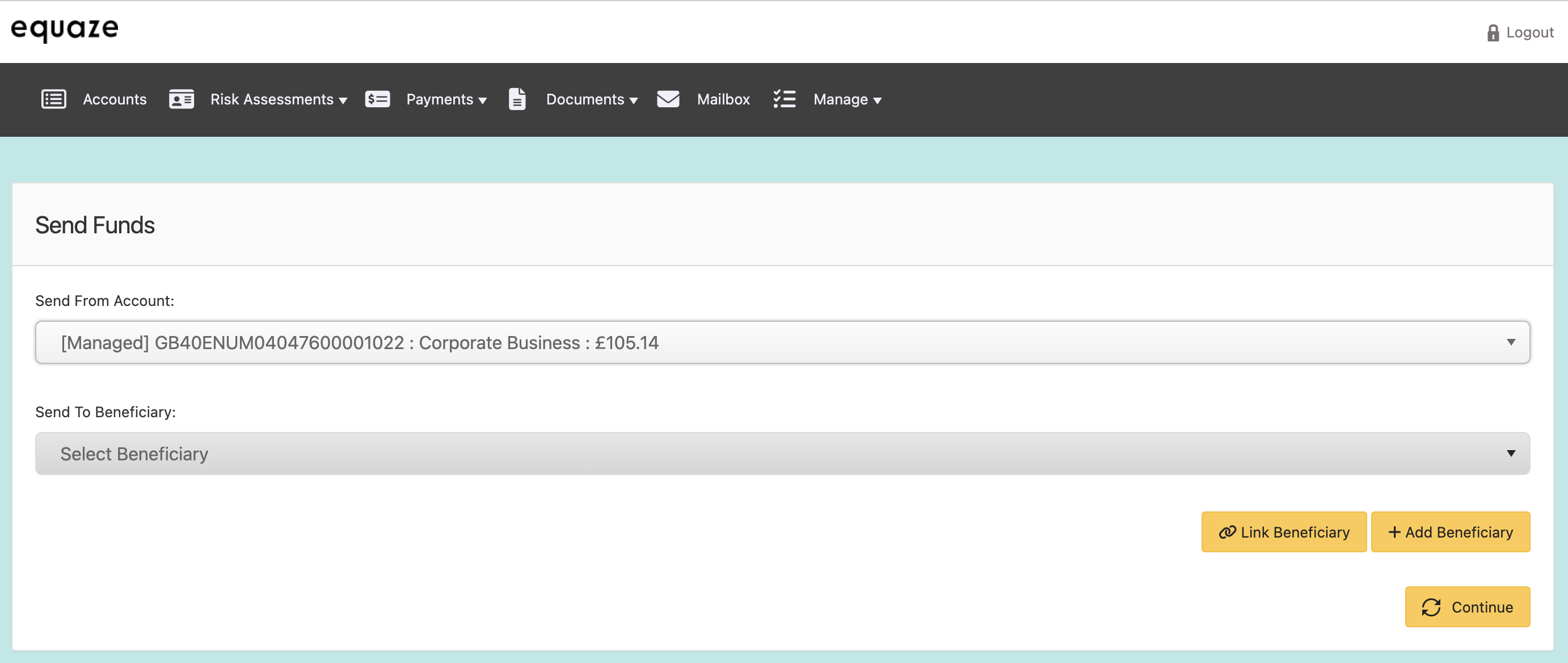 On the Send Funds page, select an account as the payment source. This is the account used to make the payment. Each account has its own beneficiaries.