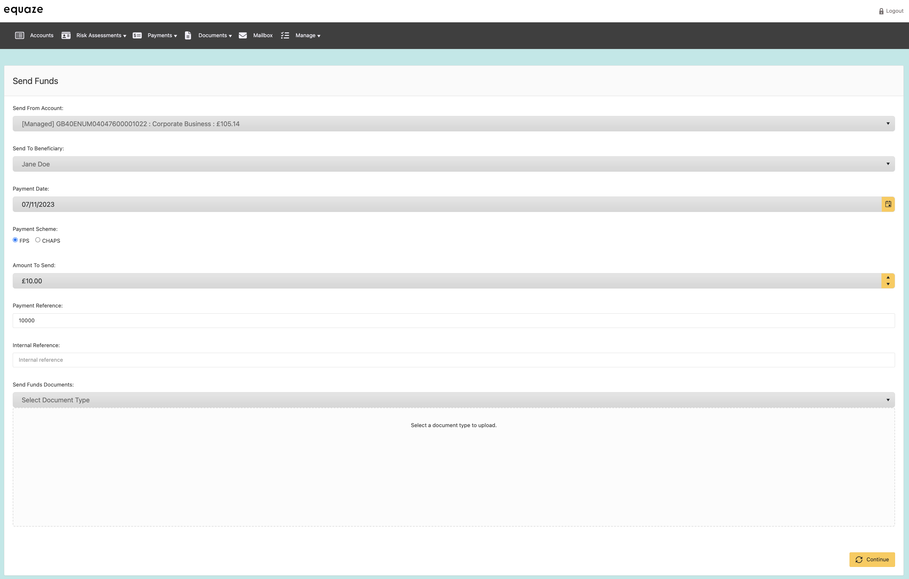 The next step is to provide more details about the payment. Choose the payment date, scheme, and the amount of money you need to pay. Also, add a reference or a description to note the request and upload any documents if we have requested you to do so. Once done, click Continue.