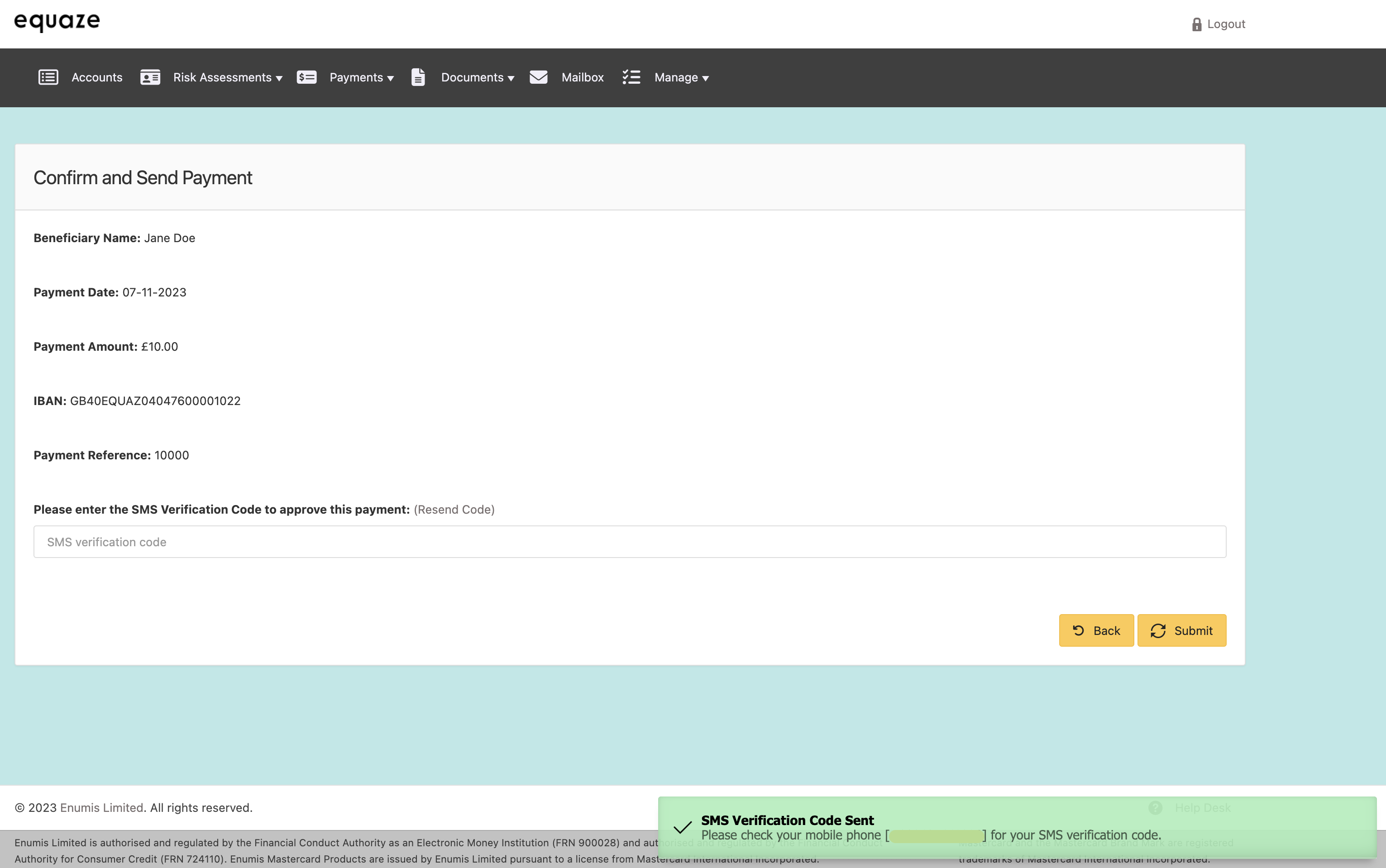 To confirm your payment request, enter your SMS verification code in the input field and click Submit.
