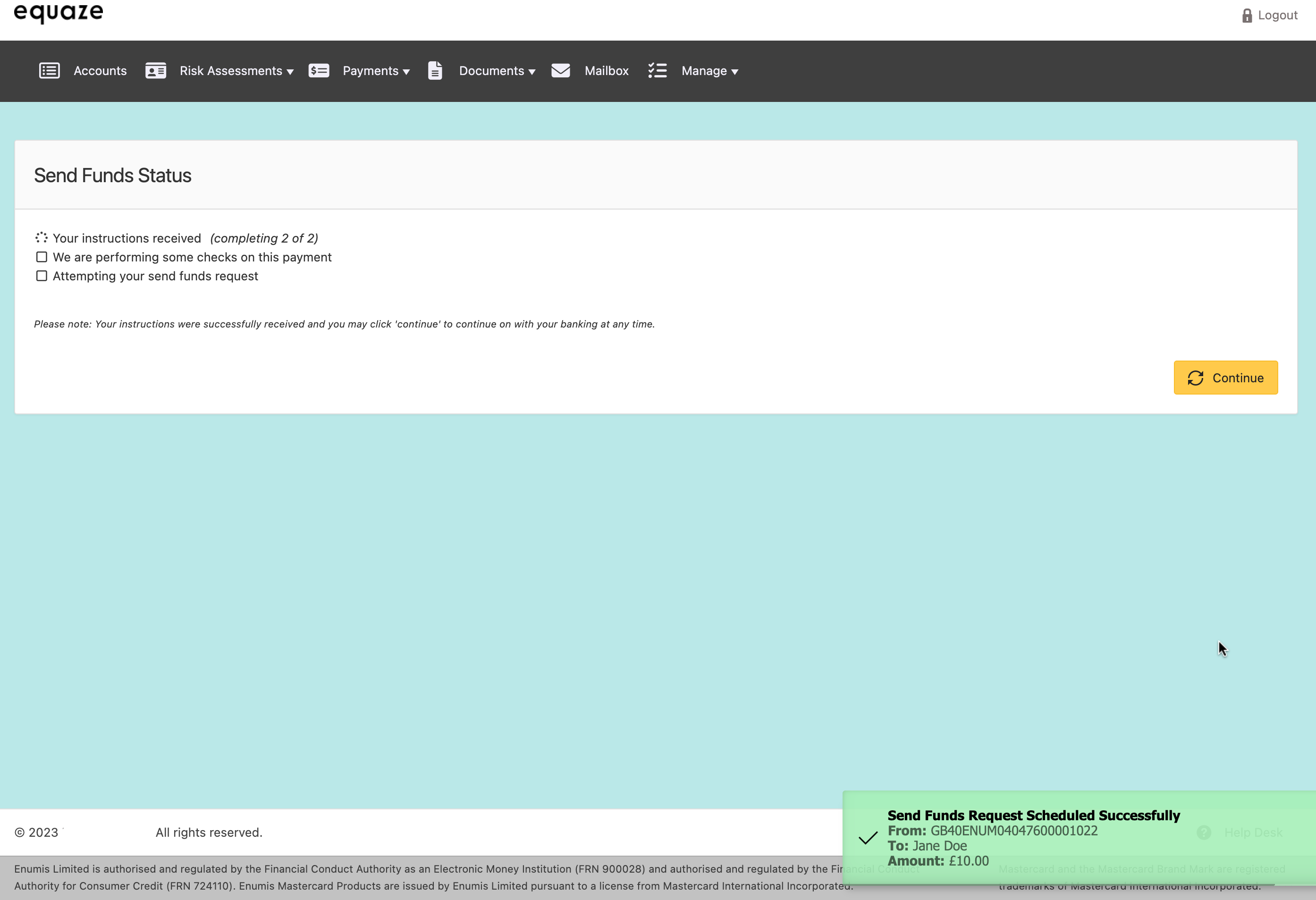 If you are a sole authority user, the Send Funds Status page appears after your payment request confirmation. The page details what our system does in the background and shows a small notification box for feedback about the successful operation.