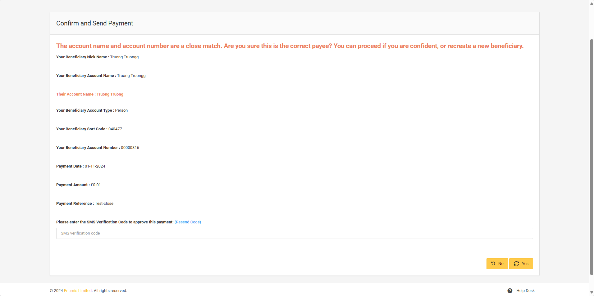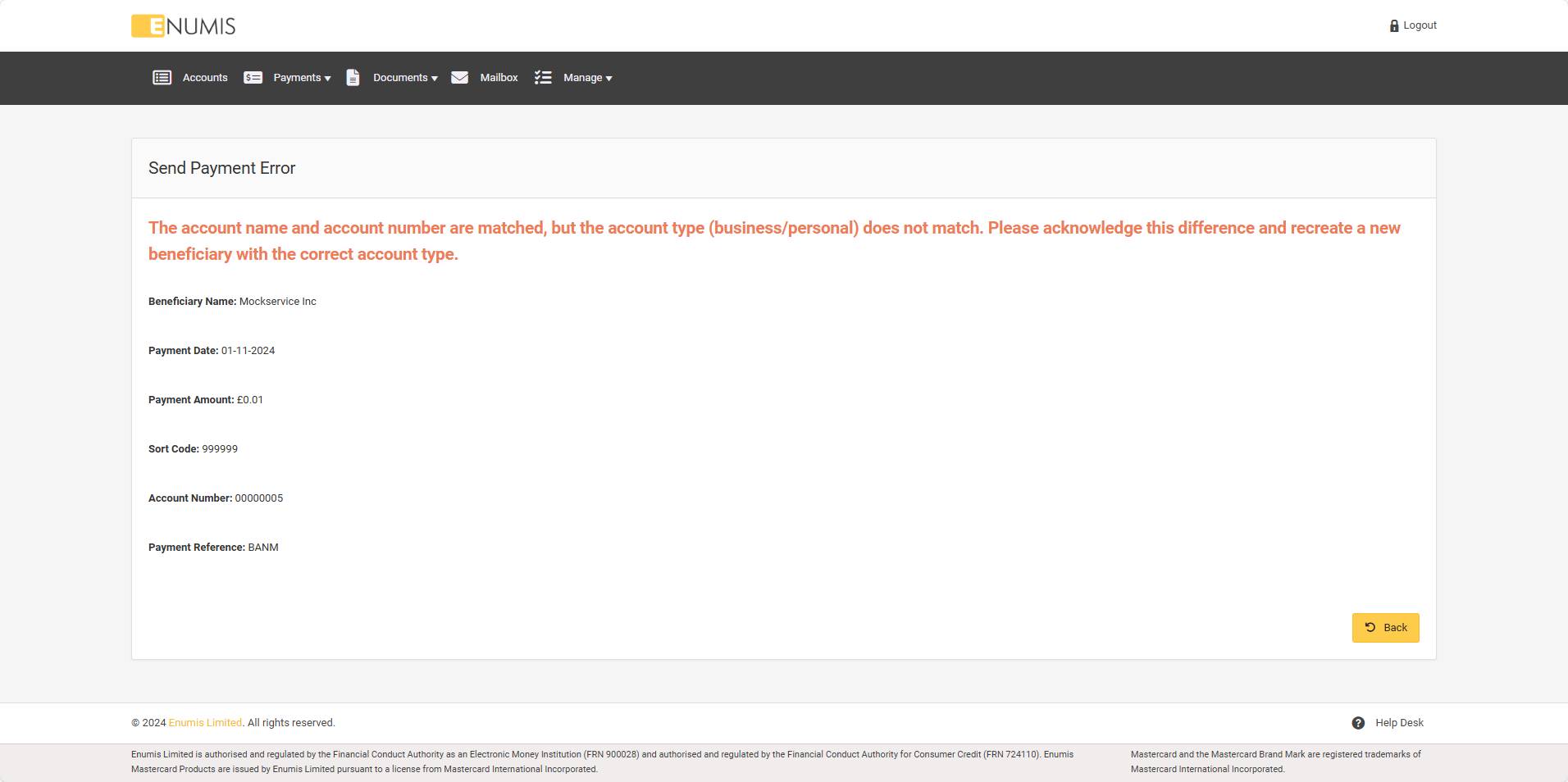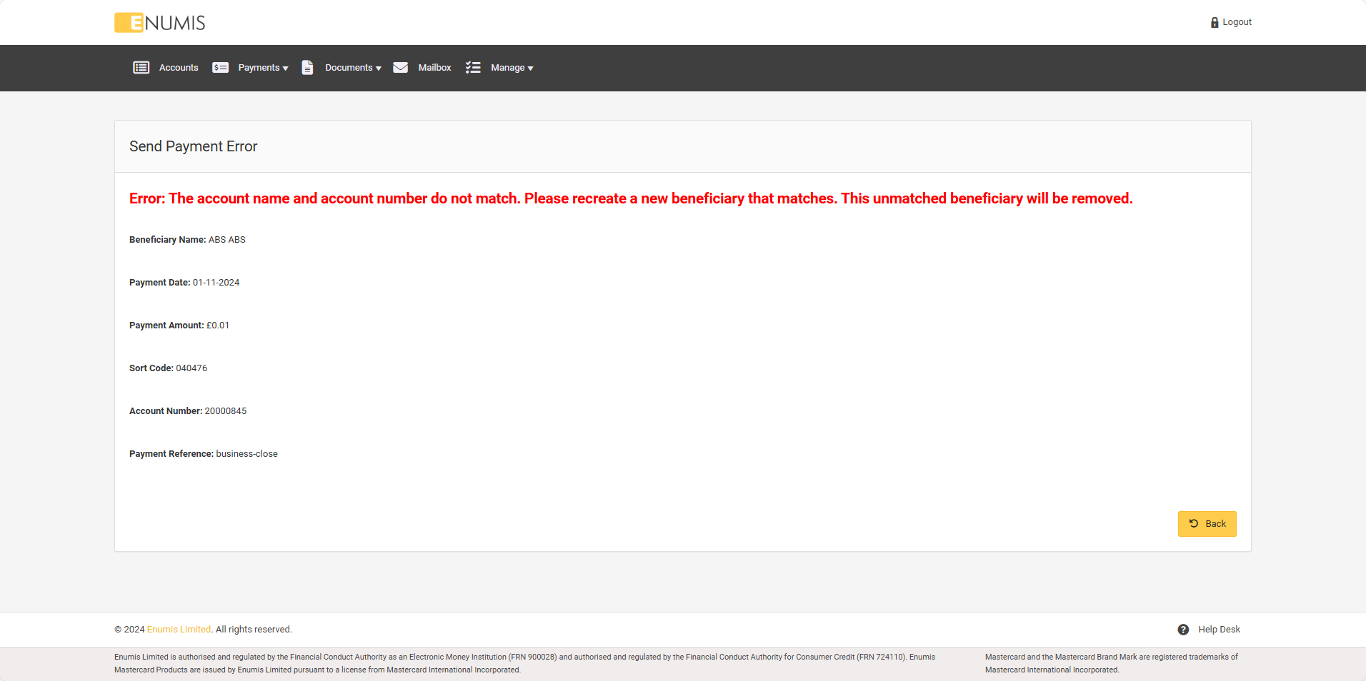 If you notice that all the details are not correct, you can return to the previous page and make corrections to the payment details, click Back. Note that if you notice beneficiary details are incorrect, you will need to delete the beneficiary and create a replacement.