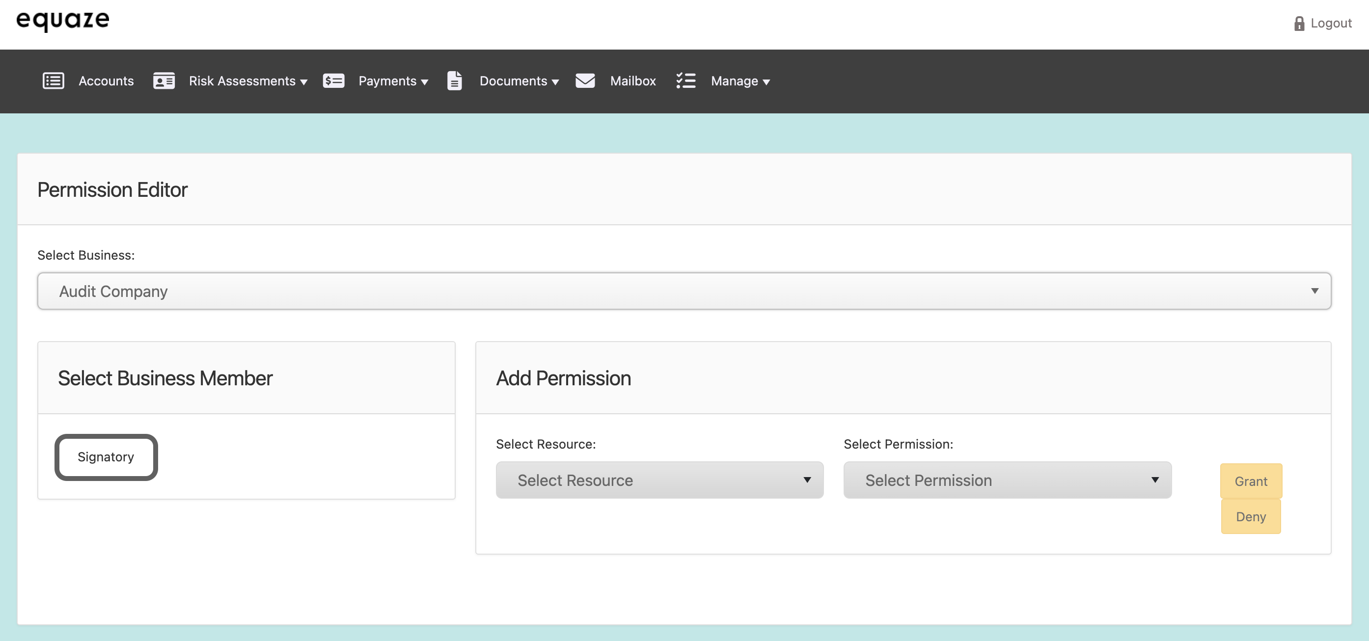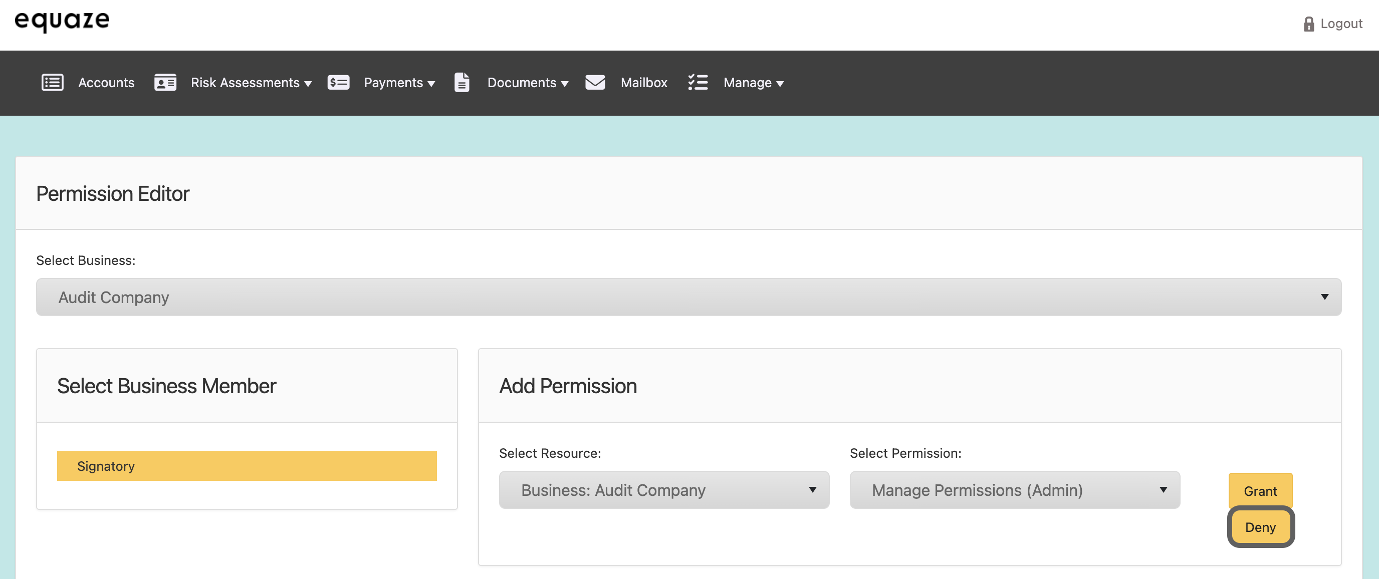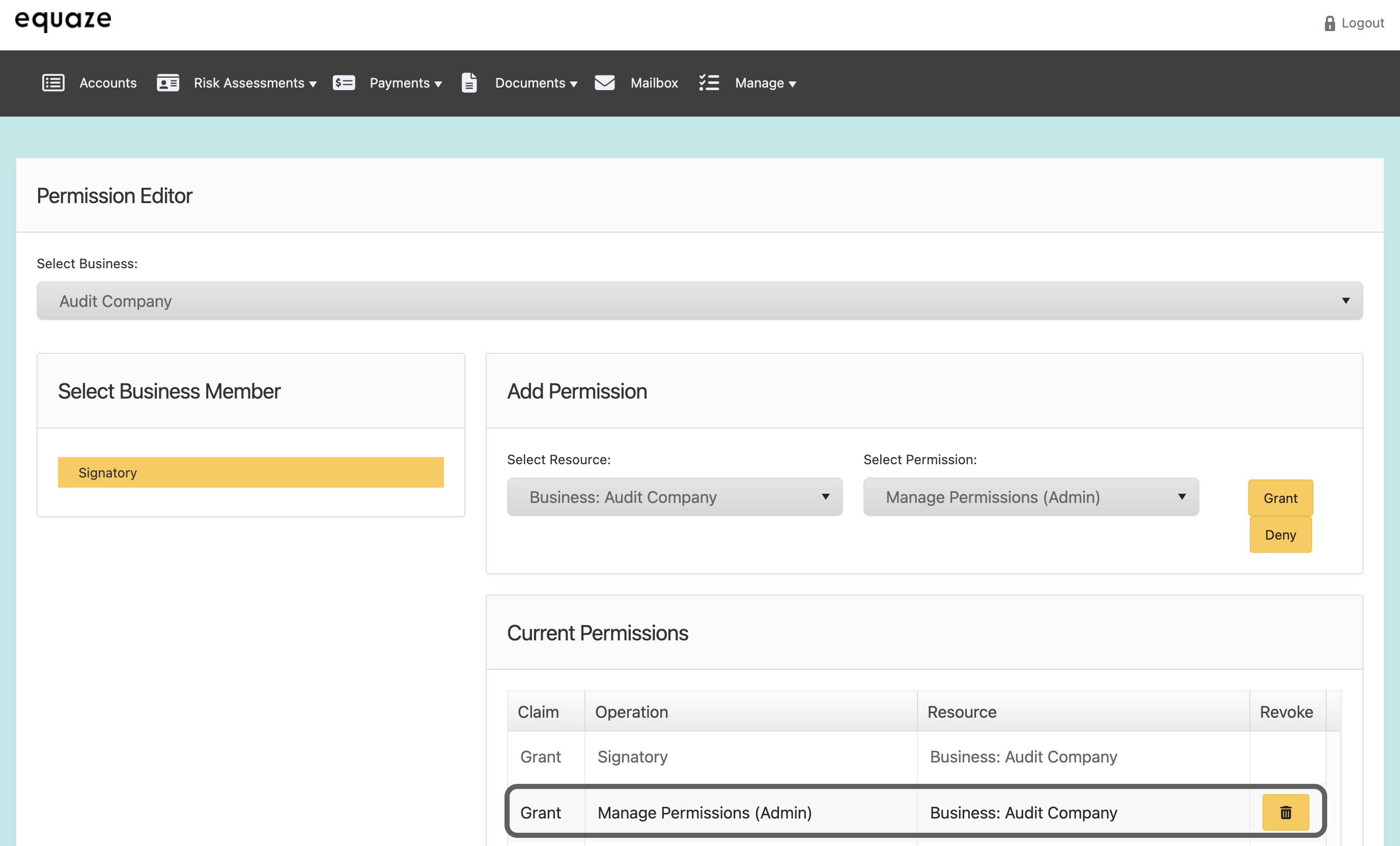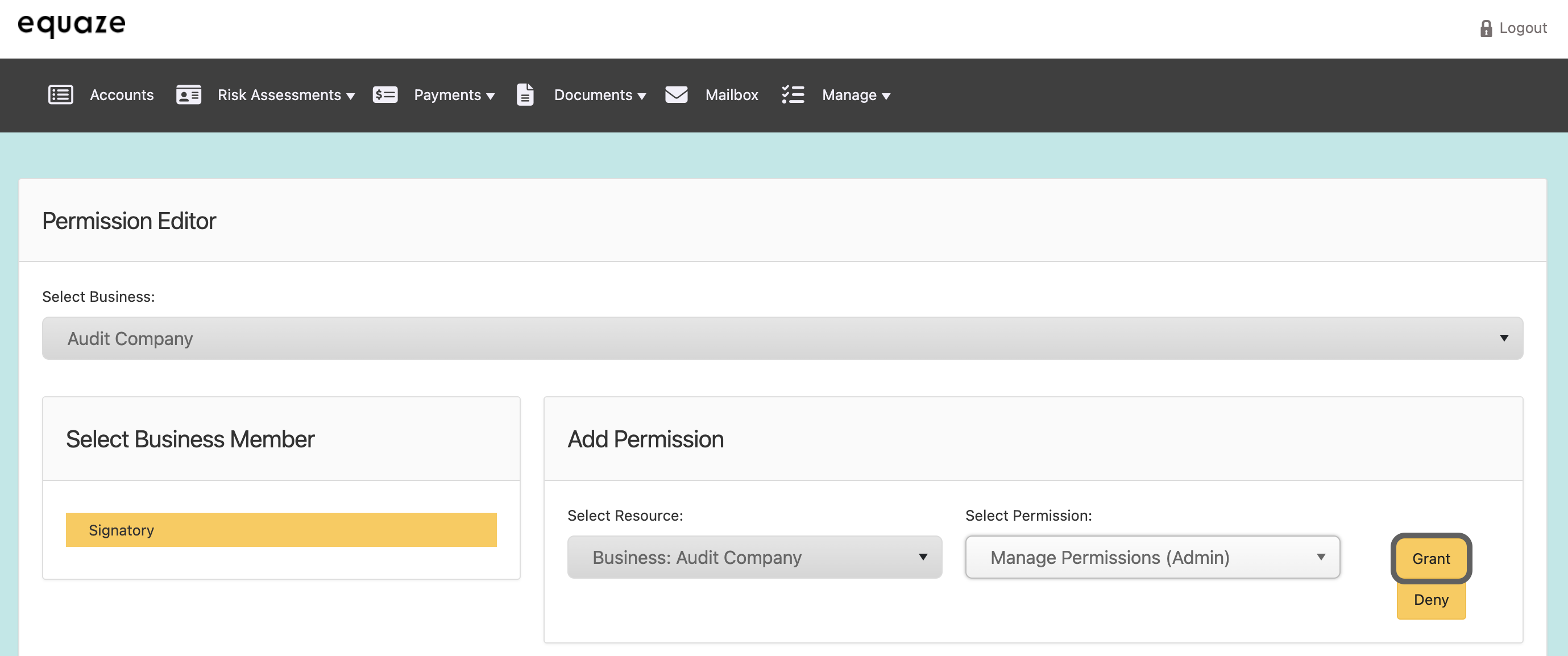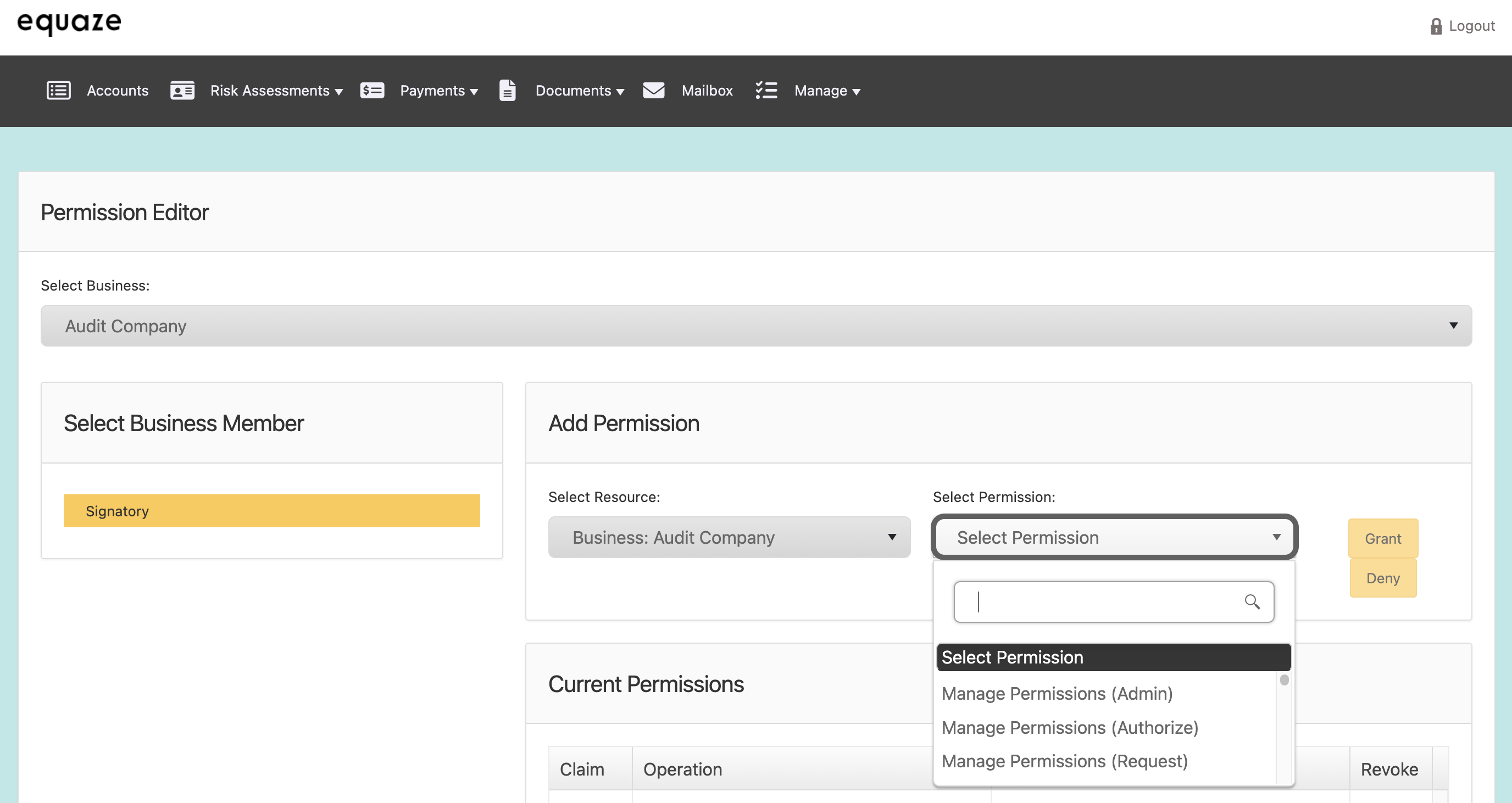 You should have an administrative or signatory role to be able to grant or deny permissions within the Permission Management section.