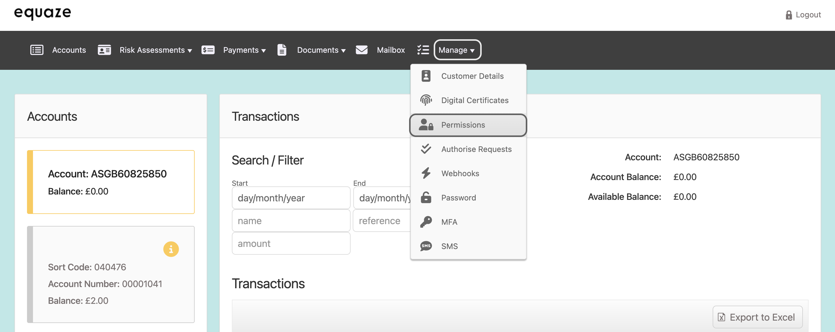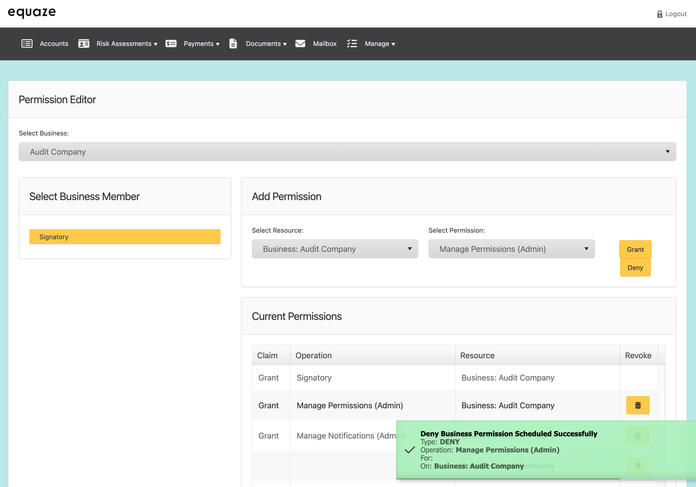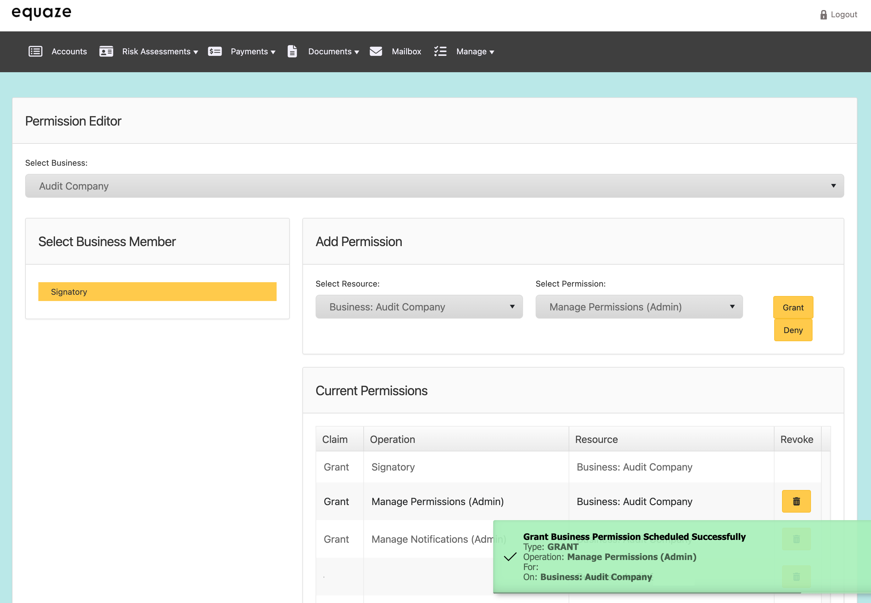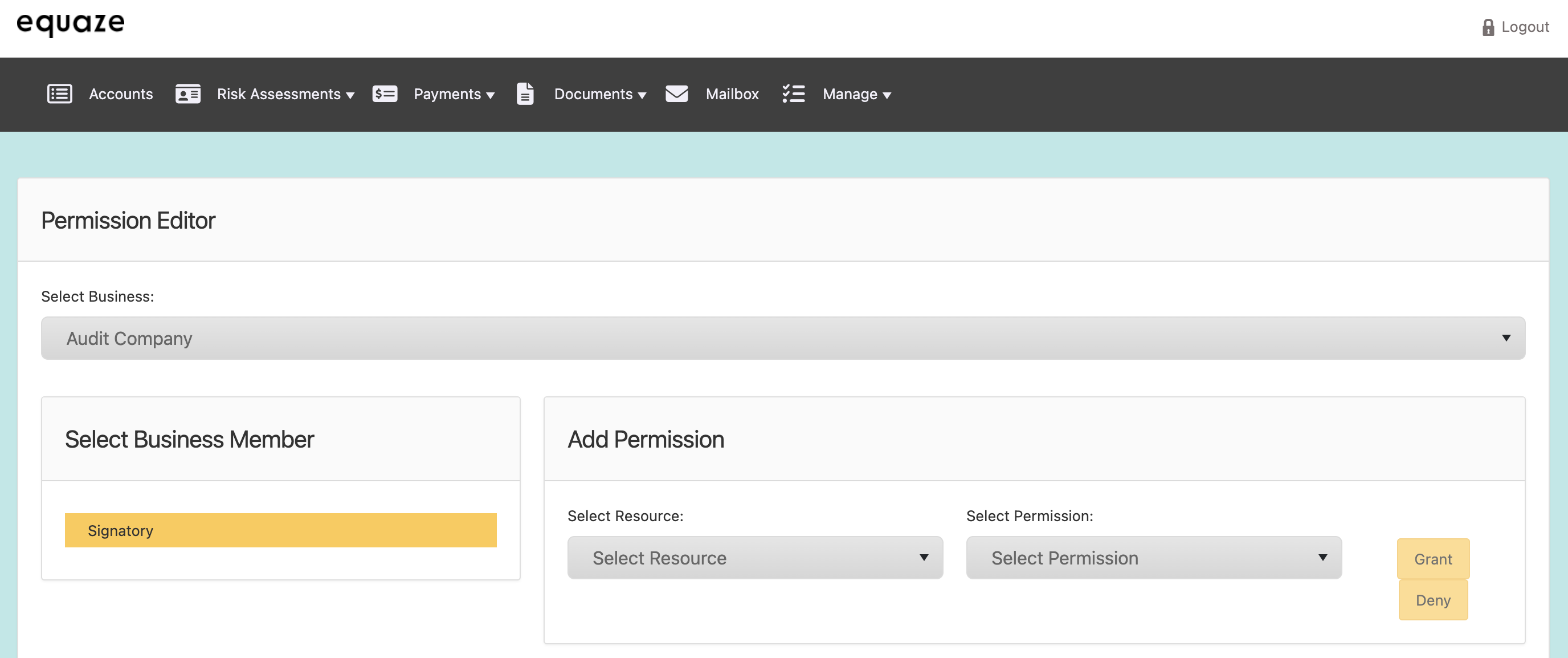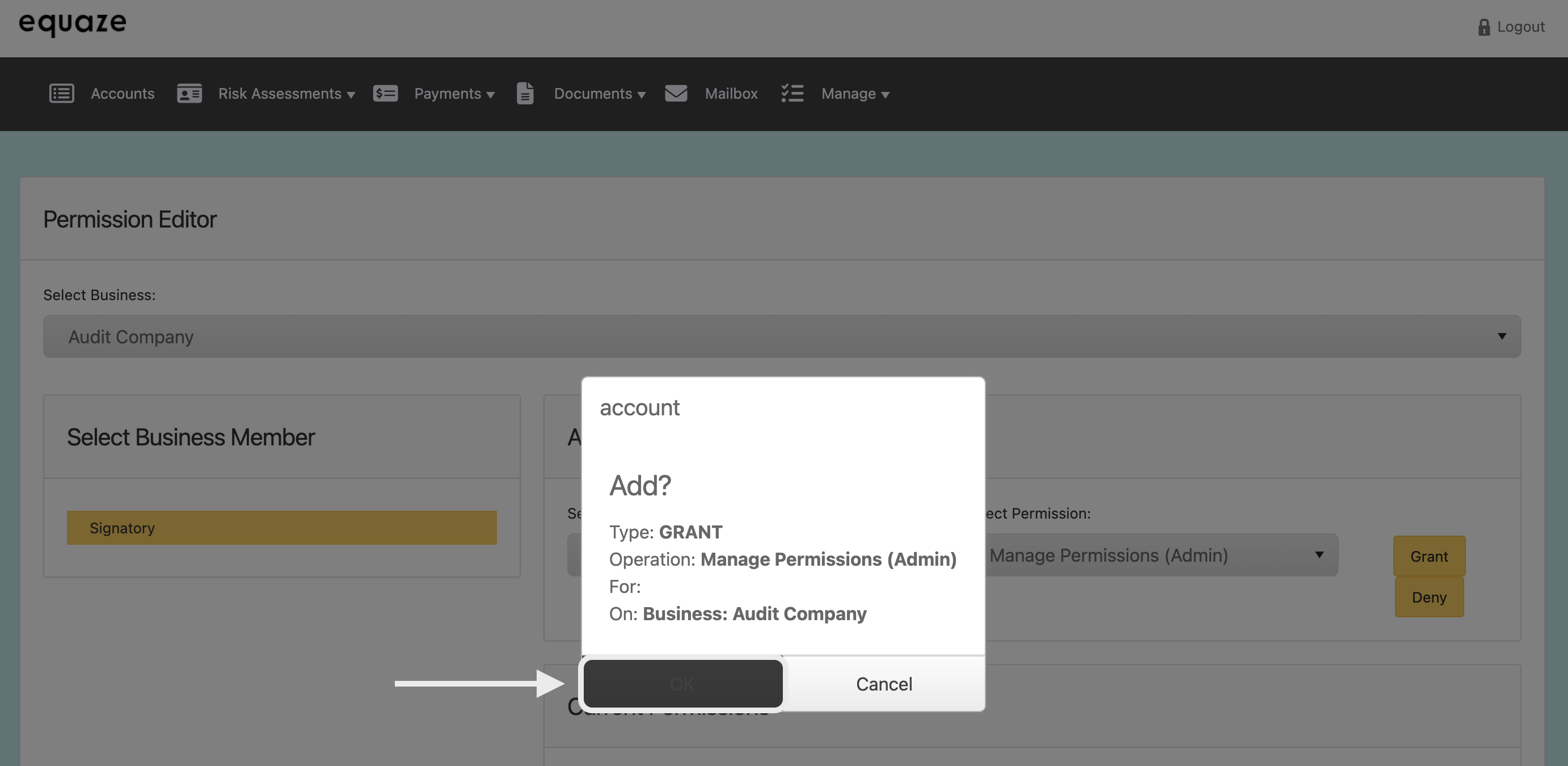 You should have an administrative or signatory role to be able to grant or deny permissions within the Permission Management section.