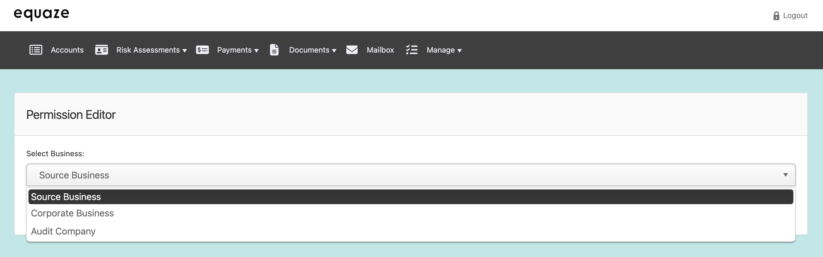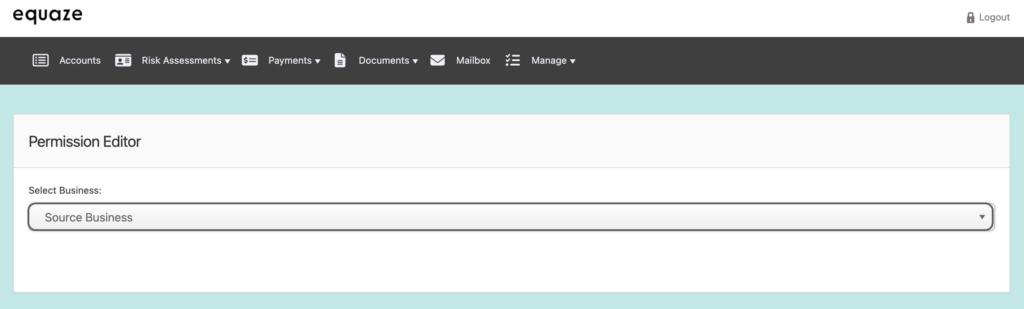 On the “Permission Editor” page, in the “Select business” section, click on the “Source business” dropdown list.